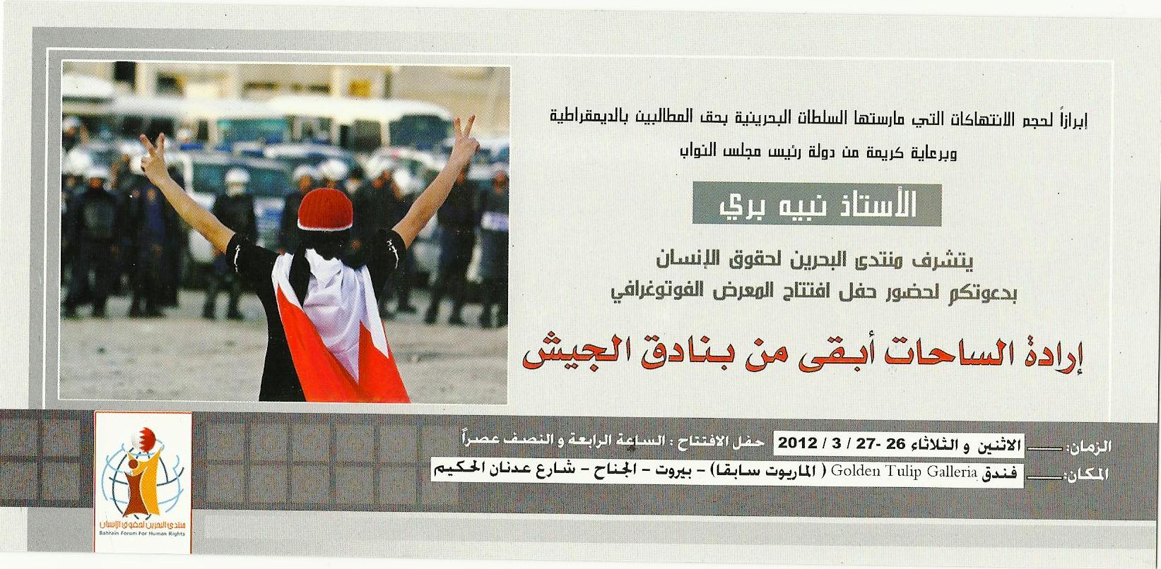 مرآة البحرين: أقام "منتدى البحرين لحقوق الإنسان" الإثنين والثلاثاء معرض صور في بيروت تحت عنوان "إرادة الساحات أبقى من بنادق الجيش"، برعاية رئيس مجلس النواب اللبناني نبيه بري بحضور شخصيات إعلامية وسياسية، وذلك للإضاءة على إنتهاكات السلطات البحرينية ضد المتظاهرين السلميين.