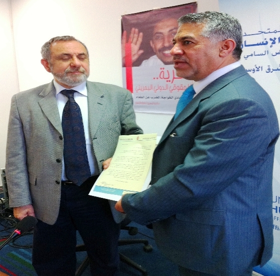 مرآة البحرين (خاص): التقى وفد من "منتدى البحرين لحقوق الإنسان" ونشطاء بحرينيون، الأربعاء، مع الممثل الإقليمي للمفوضية السامية لحقوق الإنسان فاتح عزام في بيروت، وسلموه رسالة تضامنية مع الناشط الحقوقي المضرب عن الطعام في السجون البحرينية عبد الهادي الخواجة.