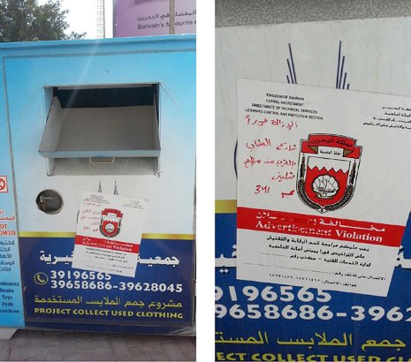مرآة البحرين: أصدرت إدارة دعم المنظمات الأهلية بوزارة العمل والتنمية الاجتماعية، تعميماً إلى المنظمات الأهلية، ومن ضمنها الجمعيات الخيرية تطالب فيه بإزالة الصناديق فوراً تفادياً للإجراءات القانونية اللازمة التي ستتخذها أمانة العاصمة بإزالتها بالطريق الإداري خلال أسبوعين من تاريخه وتحميل المنظمات تكاليف الإزالة.