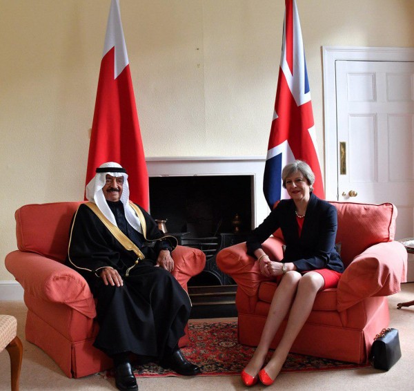 وخلال زيارته، التقى رئيس الوزراء البحريني، نظيرته البريطانية تيريزا ماي مؤكداً على "ضرورة الاستمرار في تكثيف الجهود لتعميقها وتطويرها على كل المستويات والمحاور".