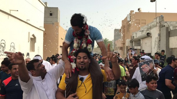 بعد انتهائه من أداء صلاة الشكر في أحد مساجد سترة، التم الشباب حوله وساروا خلفه في موكب زفاف بالسيارات حتى وصل منطقته العكر، وهناك كانت المفاجأة "جموع الأهالي المنتظرين عند مدخل البلدة: رجال، شباب، نساء وبنات، لم نتوقع أبدا أن يقف له هذا الكم الهائل من الناس في حر الشمس والظهيرة عند الساعة الثانية والنصف ظهراً"، تقول مريم "فرحت كثيرا عندما شاهدت الأهالي تستقبل عبدالعزيز، شعرت وكأنهم يستقبلوني أنا أيضا، شعرت بالزهو، الرجال والنساء يحملون سعف النخيل ويزفّون عبد العزيز، الشباب حملوه فوق أكتافهم، تلك اللحظات مسحت همّ السنوات الخمس الفائتة وحزنها وألمها وصبرها، كانت الناس تقول: هذي زفة العرس وزفة الحرية. كان مشهدا مؤثرا جدا، وهكذا اكتملت زفة عرسنا في يوم حريته".