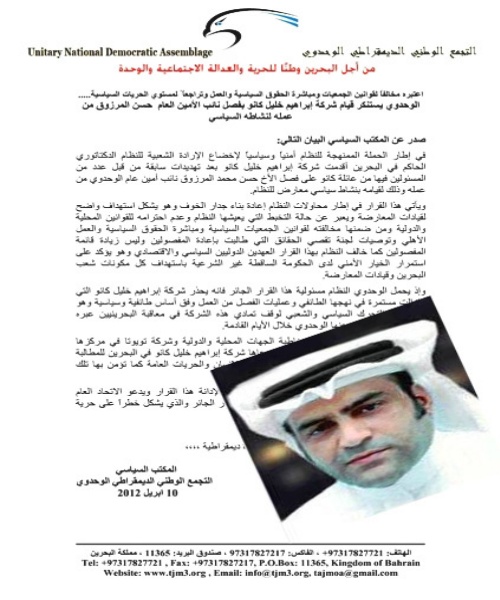 مرآة البحرين (خاص): استنكرت الجمعيات السياسية المعارضة (الوفاق، الإخاء، القومي الديمقراطي، الوحدوي، الوطني الديمقراطي، العمل الاسلامي) الفصل التعسفي لنائب الأمين العام لجمعية "التجمع الوطني الديمقراطي الوحدوي" حسن المرزوق من عمله أمس في شركة "خليل ابراهيم كانو"، وذلك على خلفية التعبير عن رأيه السياسي.