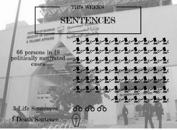 وأضاف المركز أنه رصد في الفترة (8 حتى 14 مايو/أيار 2017) اعتقال 8 مواطنين بينهم امرأة، فيما أحصى صدور أحكام بحق 66 مواطنا في 19 قضية ذات خلفية سياسية، منهم 3 حكموا بالمؤبد وواحد حكم عليه بالإعدام (ماهر الخباز).