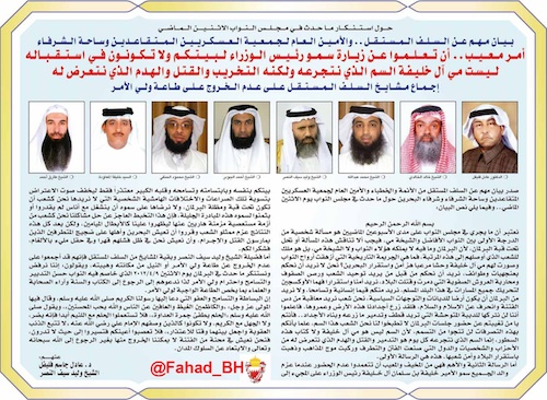 فيما صدر بيان عن جماعة أسمت نفسها بـ "السلف المستقل" -يوقع عنها كل من العقيد الذي كان فاراً من العدالة عادل فليفل والشيخ وليد سيف النصر- استنكر عدم حضور النواب، وأكد الإجماع على عدم الخروج عن طاعة ولي الأمر، وكان واضحاً أن البيان يأتي في سياق أوامر فوقية بغلق ملف الشيخة مي داخل البرلمان، والتوجيه لمنع أي اختلاف في البيت الموالي، أو أي توجه يمكن أن يشتت الجهود عن دورها الوحيد المطلوب منها وهو الضرب في الحركة الاحتجاجية، ولهذا جاء في البيان: "السم ليس هو مي آل خليفة ولا كاتب هذه السطور، إنما السم الذي نتجرعه كل يوم هو التدمير والقتل والهدم الذي نتعرض له من الأحزاب والشخصيات والدول التي صنعت الفتن والتطرف".