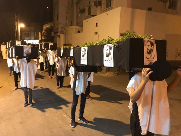 ورفعت المتظاهرون صورا للشهداء، ورددوا شعارات مناوئة للملك حمد بن عيسى آل خليفة الذي حملوه مسؤولية قتل 5 متظاهرين وإصابة العشرات واعتقال المئات خلال الهجوم.
