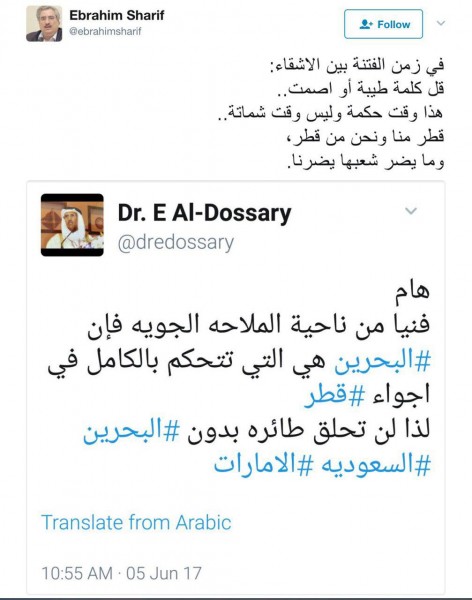 وردّ المعارض البحريني، إبراهيم شريف، القيادي في جمعية "وعد" المعارضة، على الدوسري قائلاً "في زمن الفتنة بين الاشقاء: قل كلمة طيبة أو اصمت. هذا وقت حكمة وليس وقت شماتة. قطر منا ونحن من قطر، وما يضر شعبها يضرنا".