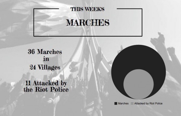 وأضاف إنه تمكن من رصد انطلاق 36 مسيرة سلمية في 24 قرية، حيث تعرضت 11 مسيرة منهم للقمع على يد الشرطة، وذلك خلال الفترة الممتدة من 24 إلى 30 يوليو/تموز 2017.