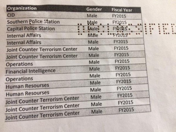 ومن بين المشاركين الـ 15، كان هناك أفراد من وحدة التّحقيقات الجنائية السيئة الصيت، ومراكز الشرطة في كل من عاصمة البلاد وجنوبها، وإدارة التحريات المالية، والمركز الدّولي لمكافحة الإرهاب. ويفيد مقرر الدّورة التّدريبية بأنّه كان مخصصًا "لتمكين المشاركين من تطوير تقنيات استخباراتية فعالة للتحقيق وإنفاذ القانون من أجل مكافحة الإرهاب".