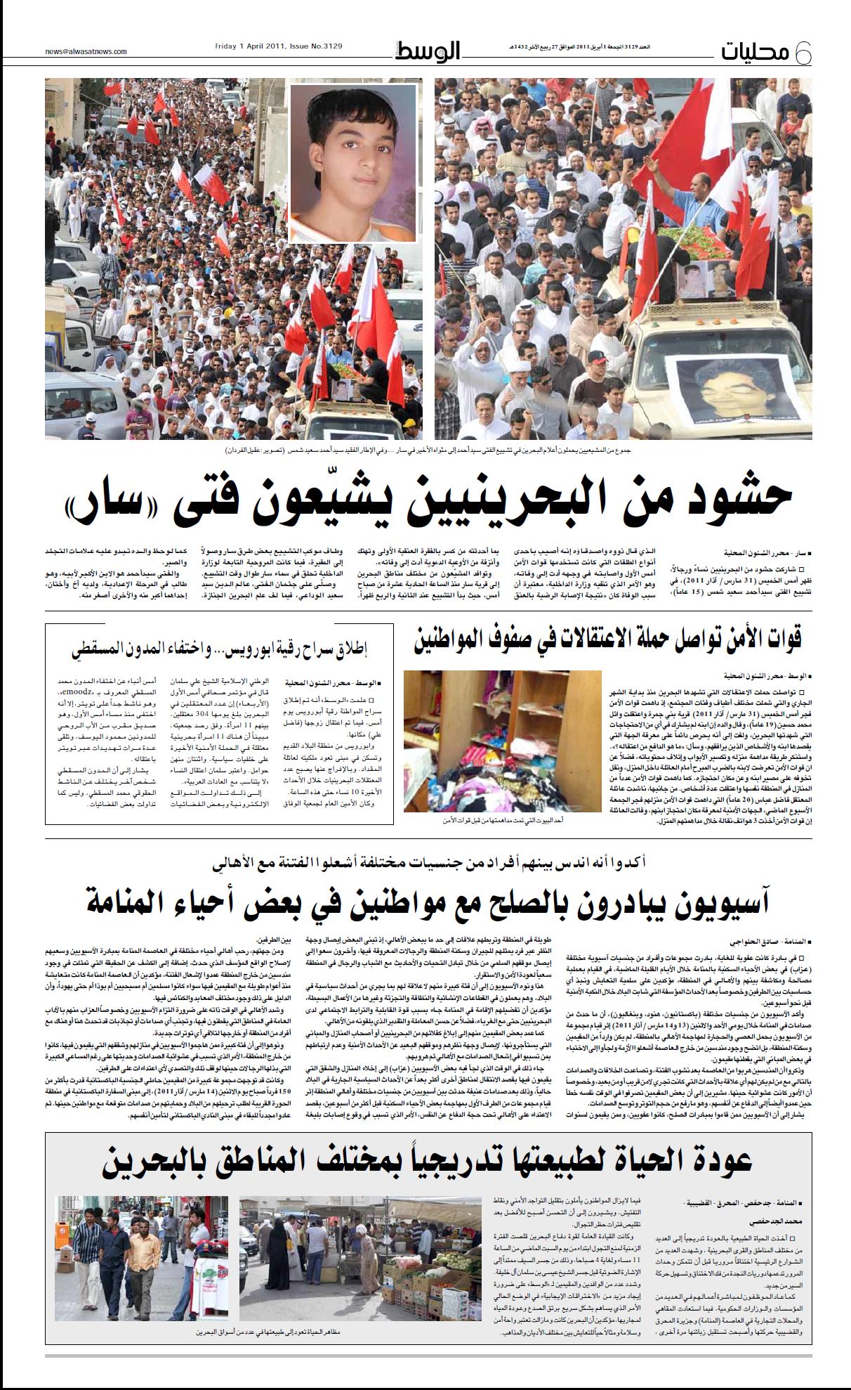 هكذا أوردت أيضا ما كانت تقوم به قوى الأمن من إطلاق للقنابل الصوتية وقنابل الغاز داخل المنازل وفي الأحياء الضيقة، وكذلك تعرض سيدة في عالي لإطلاق نار غير معروف المصدر، وكيف كانت المناطق والقرى تعيش الهلع والخوف وكيف يتحصن الأهالي بالانتقال إلى أكثر المناطق هدوءا. إلى جانب ذلك، سلطت الوسط الضوء على منع السعودية دخول البحرينيين لأراضيها عبر جسر الملك فهد.