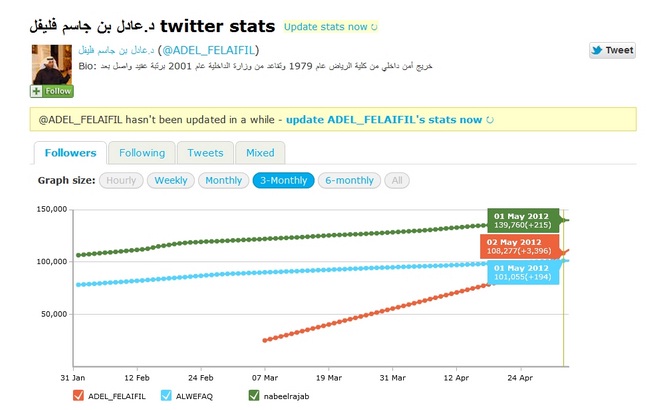في الوضع الطبيعي، وخصوصاً في المنطقة العربيّة، يزداد أعداد المتابعين في تويتر ضمن معدل العشرات والمئات. ففي البحرين، إذا أخذنا أكبر حسابين، وهم لجمعية لوفاق ونبيل رجب، فإنّ متوسط الزيادة هي ما بين 200-300 متابع في اليوم، مع استثناء الأيام التي تحفل بأحداث كبيرة، حيث يتزايد عدد المتابعين من حول العالم.