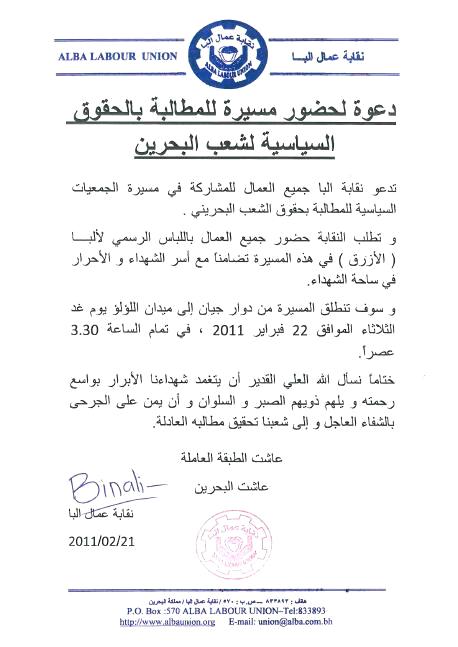 شركة ألومنيوم البحرين (ألبا) هي صاحبة أكبر عملية فصل ممنهج، والوحيدة التي جيّرت فيها النقابة ضد العمال، بعد أن اشترك رئيس النقابة علي البنعلي في جلسات التحقيق مع الموظفين وشارك في إصدار قرارات الفصل ضدهم. ماطلت ألبا كثيرا في إرجاع المفصولين بعد صدور تقرير بسيوني، وكحال الشركات والمؤسسات الأخرى لم يكن لخطابات الملك وما يسميها أوامره أي تأثير على قراراتها في هذا الشأن.