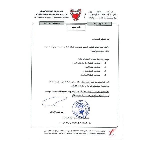 وأكدت بلدية الجنوبية بأنه لن يتم احتساب الرسوم المذكورة في الإشعار والبالغة خمسين دينار ولكن سيتم مراجعة المستندات المرسلة من المراجعين ودراستها وتحديد الرسم الصحيح ثم الاتصال بالمراجع لإفادته بالرسم.