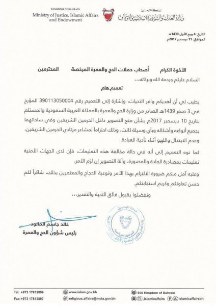 وتضمن التعميم الصادر من وزارة الحج والعمرة بالمملكة العربية السعودية والمستلم بتاريخ 10 ديسمبر/كانون الأول 2017 والذي يقضي منع التصوير داخل الحرمين الشريفين و في ساحاتهما بجميع أنواع و أشكاله و بأي وسيلة كانت، وذلك احتراماً لمشاعر مرتادي الحرمين الشريفين، و عدم الابتذال و اللهو أثناء تأدية العبادة.