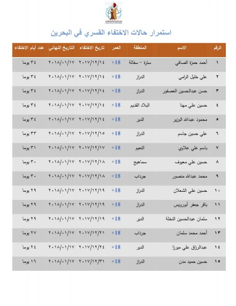 وأشار المنتدى إلى أنَّ هناك خمس حالات استمرت في الاختفاء القسري لمدة 34 يوما منذ 14 ديسمبر/كانون الأول 2017 لغاية 17 يناير/كانون الثاني 2018، وهم أحمد حمزة الصافي من سترة، علي خليل الرامي وحسن عبد الحسين العصفور من منطقة الدراز، وحسين علي مهنا من البلاد القديم، ومحمود عبد الله الوزير من الدير.