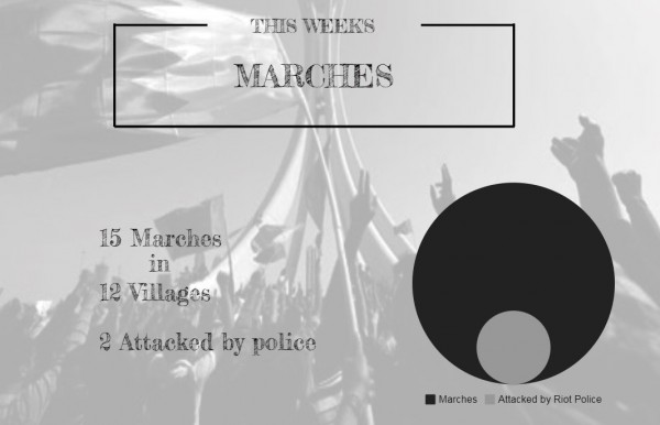 ووفق المركز تم رصد 15 مسيرة سلمية خرجت مناطق مختلفة من البلاد، تعرضت اثنتين منها للقمع على يد قوات الأمن.