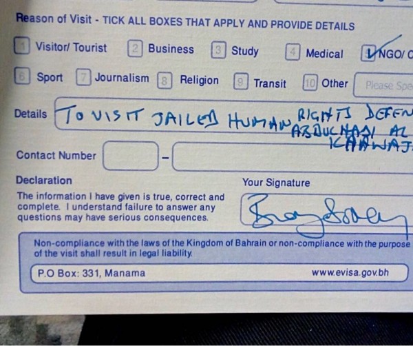 استمارة دخول البحرين وقد كتب عليها أن سبب الزيارة هو رؤية الناشط الخواجة في السجن