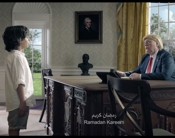 وتضمن الإعلان مشاهد تمثيلية ظهرت فيها شخصيات جسدت الرئيس الأمريكي دونالد ترامب ونظيره الروسي فلاديمير بوتين، والمستشارة الألمانية أنغيلا ميركل.