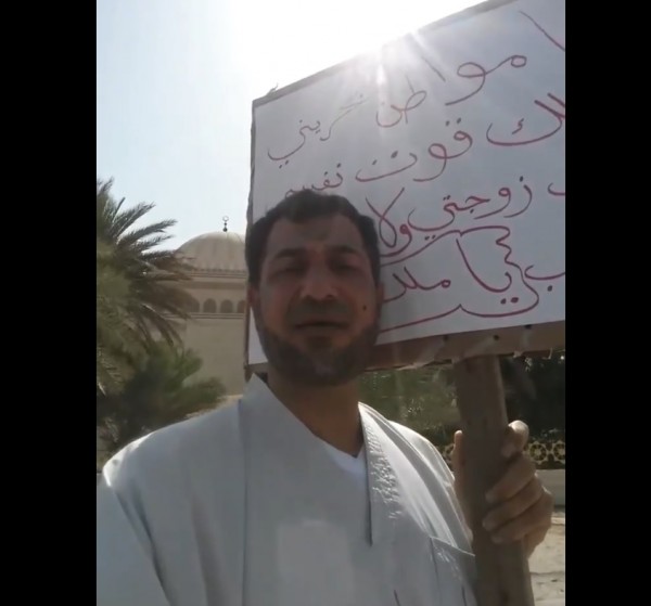 وخاتم سجين سابق، وأب لـ 4 أطفال، بدأ التغريد من حسابه في تويتر في شهر فبراير/شباط الماضي، وبث تسجيل فيديو له يوم أمس يقول فيه إنه مفصول عن العمل بوزارة البلديات منذ 5 سنوات، وإنه سيخرج غدا صباحا بهذه اللافتة في الشوارع، ولن يرجع إلا بعد أن يجد له المسئولون حلا، موجها خطابه لملك البلاد، ورئيس الوزراء، وولي العهد.