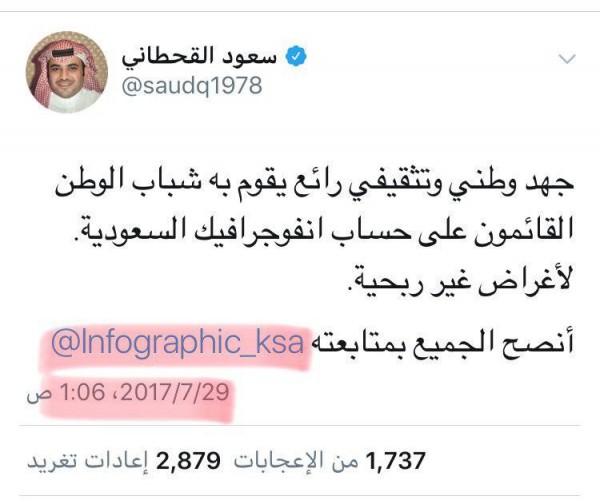 وعلقت وزارة الإعلام السعودية بأنه "ورد لها شكاوى بخصوص صورة مصاحبة لإنفوجرافيك نشره حساب إنفوجرافيك السعودية على موقع تويتر". وأوضحت في تغريدة لها عبر حسابها الرسمي بموقع تويتر" أنها "أخطرت المواطن صاحب الحساب بإغلاق الحساب لحين انتهاء الإجراءات النظامية والتحقيق في الموضوع وفقًا للأنظمة الخاصة بالنشر الإلكتروني المعمول بها في المملكة". ومن جانبه، علق إنفوجرافيك السعودية على الواقعة بقوله: "الحساب نشر صورة إنفوجراف غير موفقة في تغريدة سابقة، وبعض المتابعين أساء فهم المقصود منها، والحساب حذف التغريدة فورًا، استشعارًا من الحساب بأنها غير مناسبة ولا تتوافق إطلاقًا مع ما ذهبت إليه بعض التعليقات". وسبق لمستشار ولي العهد السعودي، سعود القحطاني، أن امتدح الحساب قائلاً "جهد وطني وتثقيفي رائع يقوم به شباب الوطن القائمون على حساب إنفواجرفيك السعودية لأغراض غير ربحية. أنصح الجميع بمتابعته".