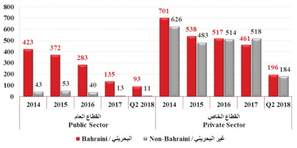 وكان عام 2017 قد سجل 1127 حالة إصابة في مواقع العمل، 979 إصابة في القطاع الخاص، و148 في القطاع العام. ووصل عدد المصابين حينها إلى 461 بحرينيا و518 غير بحريني.