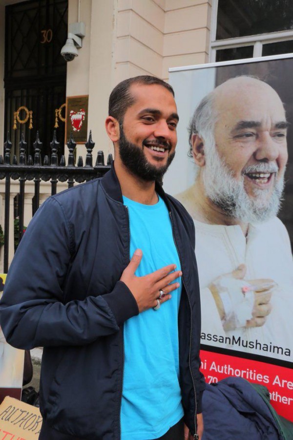 من اعتصام علي مشيمع، نجل حسن مشيمع، أمام السفارة البحرينية في لندن