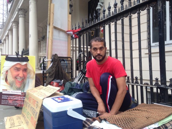 بدأ علي مشيمع إضرابًا عن الطعام على عتبة السفارة البحرينية في لندن منذ 24 يومًا من أجل والده، حسن مشيمع، البالغ من العمر 70 عامًا، وهو أحد أبرز السجناء السياسيين في البحرين، والذي حُرِم من فحص السرطان.