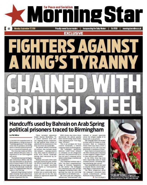 مرآة البحرين (خاص): ذكرت صحيفة مورنينغ ستار أن شركة بريطانية لصنع الأصفاد مقرها في بيرمنجهام متهمة "بدعم القمع" في البحرين على خلفية ادعاءات باستخدام منتجاتها لتقييد السجناء السياسيين في سجن بحريني سيء السمعة.