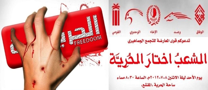 بدورها، فقد تحدت الجمعيات هذا القرار، وواصلت نشر دعوتها والحشد للتجمع. هذا ومن المقرر أن يبدأ التجمع الذي اختارت له عنوان "الشعب اختار الحرية" في تمام الساعة الثامنة والنصف بساحة الحرية في منطقة المقشع، غربي العاصمة المنامة. وهذه هي المرة الخامسة في ظرف شهر الذي تمنع فيه الوزارة تجمعا للجمعيات المعارضة المرخصة.