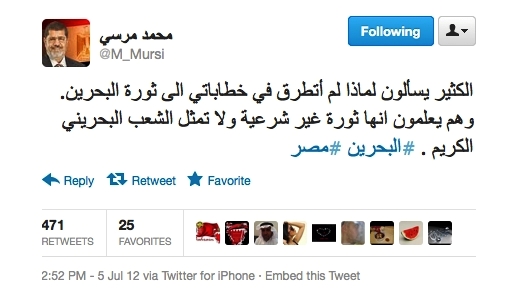 وجاء في الحساب (M_Mursi@) الذي اعتمدت له "بروفيل" مضلل على أساس أنه الحساب الرسمي للرئيس مرسي "الكثير يسألون لماذا لم أتطرق في خطاباتي إلى ثورة البحرين. وهم يعلمون أنها ثورة غير شرعية ولا تمثل الشعب البحريني الكريم".