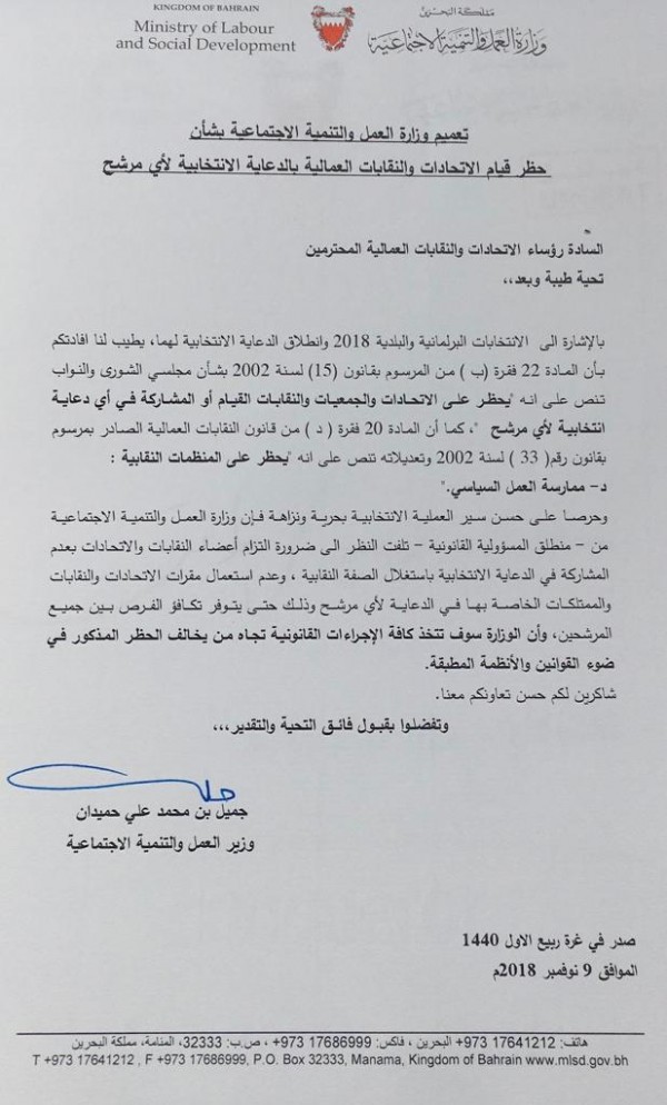 مرآة البحرين: أصدرت وزارة العمل والتنمية الاجتماعية تعميماً مكتوباً بعثته للاتحاد العام لنقابات عمال البحرين، والاتحاد الحر، والنقابات العمالية تؤكد فيها على منعهم منعهم من الترويج أو الدعاية لأي من المرشحين للانتخابات البرلمانية والبلدية القادمة، وتؤكد لهم أن القوانين والأنظمة تحظر ممارستهم العمل السياسي.