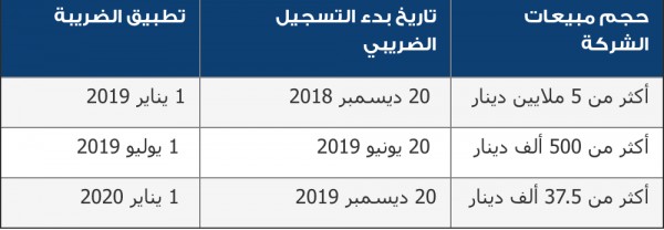 وأكدت الوزارة أن عملية تسجيل الشركات في النظام الضريبي للحصول على الرقم الضريبي للشركات التي لديها مبيعات خاضعة للقيمة المضافة، سيبدأ في 20 ديسمبر المقبل، على أن يتم تقديم الإقرارات الضريبية للشركات التي تتجاوز مبيعاتها 5 ملايين دينار كل ثلاثة أشهر، بينما الشركات التي مبيعاتها أقل من 5 ملايين ستقدم إقرارات كل 6 أشهر.