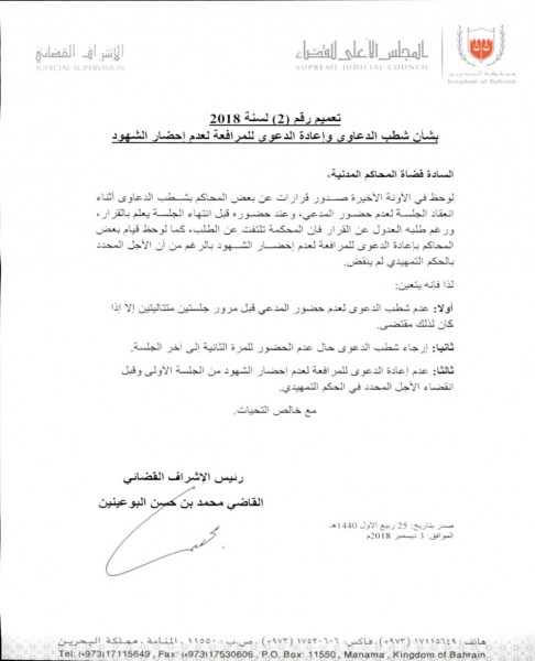 مرآة البحرين: أصدر رئيس الإشراف القضائي القاضي محمد البوعينين تعميما أمر فيه بعدم شطب الدعاوى إلا بعد مرور جلستين من عدم حضور المدعي، ويمهل حتى نهاية الجلسة الثانية، وبعدم إعادة الدعوى للمرافعة لعدم إحضار الشهود.