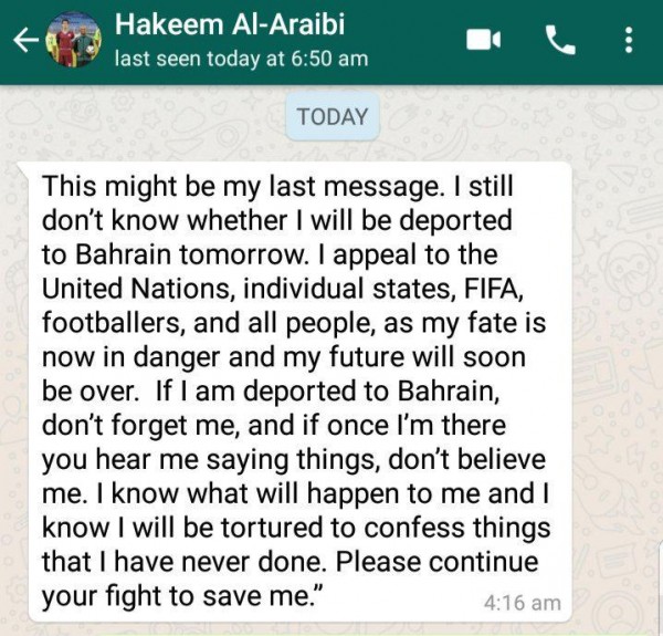 وكان العريبي قد وجه اليوم الجمعة صباحًا رسالة مفادها "قد تكون هذه رسالتي الأخيرة" مضيفًا : "لا أعلم ما إذا كان سيتم ترحيلي إلى البحرين غدًا. أناشد الأمم المتحدة، والدول، ومنظمة الفيفا ولاعبي كرة القدم والجميع، حيث إن مصيري في خطر وسينتهي مستقبلي قريبًا".