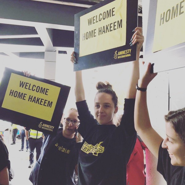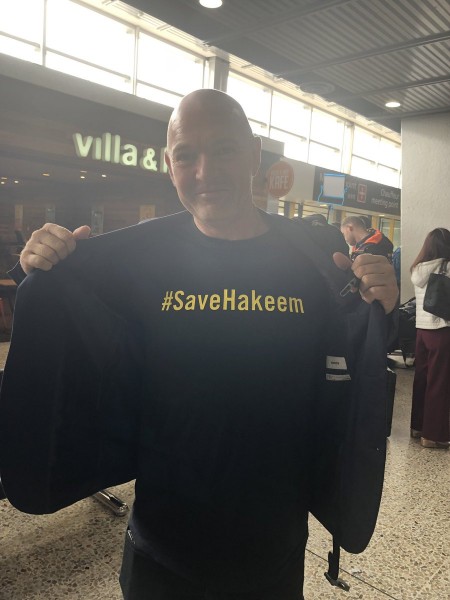 وأظهرت صور كريغ فوستر وهو يقف إلى جانبه، حيث تحدث (فوستر) لاحقا إلى وسائل الإعلام وشكر المتضامنين مع حكيم حول العالم.
