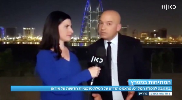 وأظهر مقطع مصور مراسلين اثنين لهيئة الإذاعة الإسرائيلية «كان» وهما يتحدثان ومن خلفهما يبدو مركز التجارة العالمي وهو أحد الأبراج الشهيرة في العاصمة المنامة.