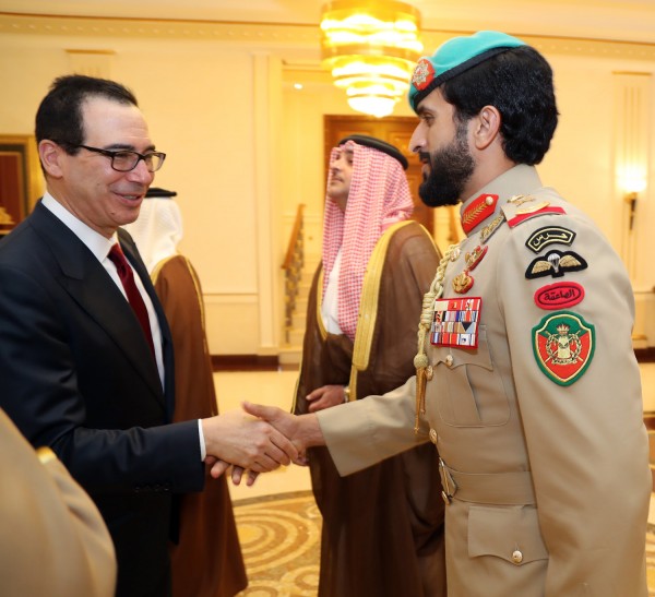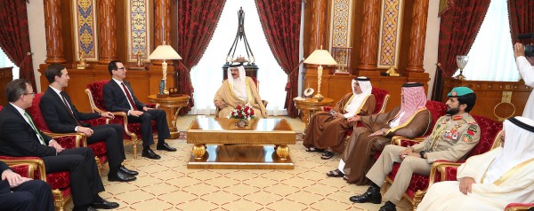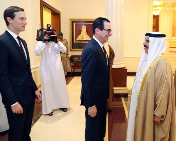 ملك البحرين مستقبلا وزير الخزانة الأمريكي ستيف منوتشين وصهر ترامب جاريد كوشنر