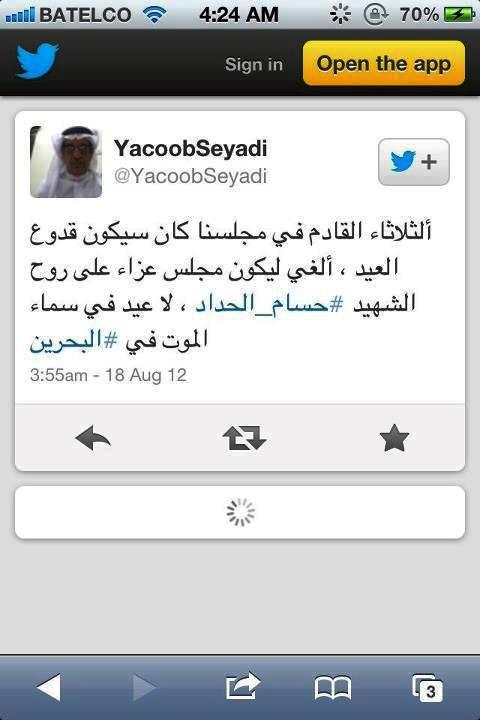 مرآة البحرين: لقي نبأ مقتل الفتى "حسام الحداد" على يد قوات الأمن في المحرق يوم أمس صدى كبيرا في أوساط الناشطين والجماهير، وألغى أحد رجالات المحرق من الطائفة السنية وهو "يعقوب سيادي" احتفاله بالعيد وقال إنه سيفتح مجلسه في "البسيتين" للتعزية باستشهاد "الحداد" وقال عبر حسابه في تويتر"لا عيد في سماء الموت في البحرين".من جهتها قالت المغردة "صباح الجنيد" إنه ليس هناك من تبرير لأي عملية قتل، وعلقت على مقتل الحداد بالقول "ازدادت الأيام سوادا في هذا الوطن" وأضافت