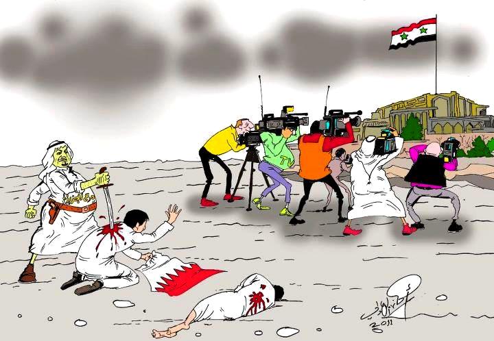 وكان الإعلام، الذي دعم ثورتي مصر وتونس، وما زال يدعم ثورة سوريا المُختطَفة، هو الغائب الأكبر عن الثورة البحرينية، حيث صدر الأمر بالتعتيم، أو أصابه مرض الزهايمر بحقِّ الثورة البحرينية. بينما في تلك الثورة يُصرِّح قادتها، وبالفم الملآن، بتبعيتهم للخارج، وتقوم دولٌ كُبرى، ومحطّات تلفزيونية كبيرة بدعم هذه الثورة بالمال والسلاح، حيث تَستجلِب كلَّ العناصر من كل الفئات، ومن مُختلف الدول، بعنوان الجهاد، للإطاحة بنظام هذا البلد. بل سُخِّر النفط في سبيل الإنفاق على مُتطلّبات إسقاط النظام، وقامت دول الخليج بحراكٍ شعبي لدعم الثورة مادّيًا، وطلب الملك عبد الله آل سعود، شخصيًا، من شعبه القيام بحملة تبرّعات لدعم الثوّار في سوريا.