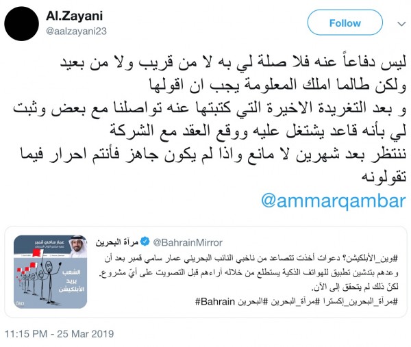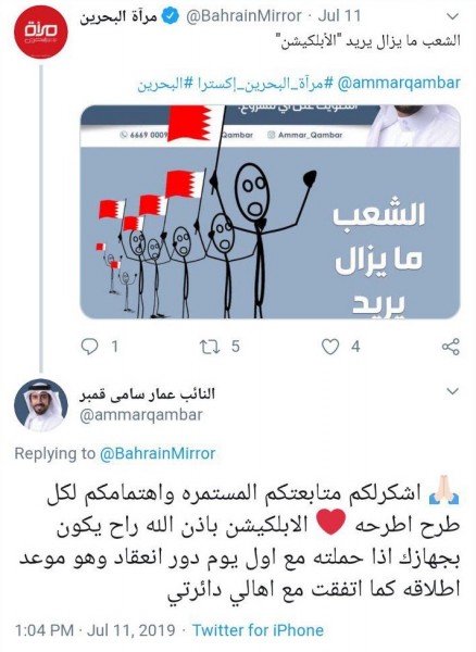 اللافت في كل ذلك هو ما ذكره قمبر في مقابلته مع صحيفة "الوطن" بأنه "سيحتوي التطبيق على أخبار النائب والمجلس والدائرة، إلى جانب خدمات الصحة والإسكان والتعليم ومقترحات المواطنين". فالواضح أن البحرينيين موعودون بتطبيق إخباري ترويجيّ للعلاقات العامّة وليس تطبيقاً فعلياً لما وعد به أوّل مرّة: "باچر فيه استبيان أو فيه سؤال في المجلس أطرح السؤال في التطبيق تصويت يصير عليه من ناخبيني. يقولون لي نعم أو لا صوتهم هوه اللي يوصل المجلس مو صوتي. آنا ممثل للشعب".