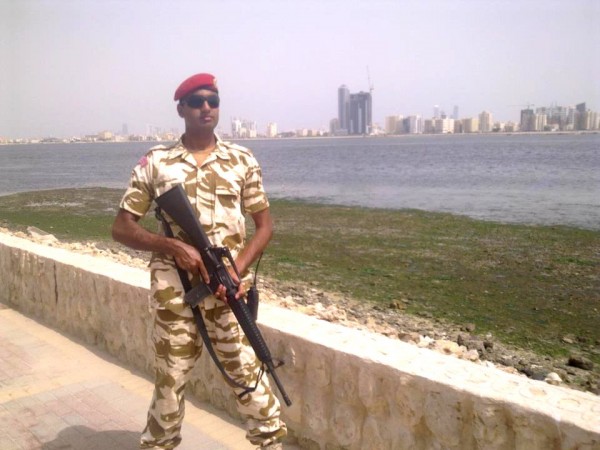 عسكري أجنبي يستعرض سلاحه في إحدى المتنزهات العامة في البحرين