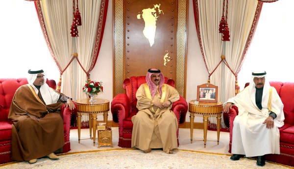 الملك يتوسط عمه رئيس الوزراء ونجله ولي العهد في لقاء رسمي مايو 2017 (الصورة لوكالة أنباء البحرين)