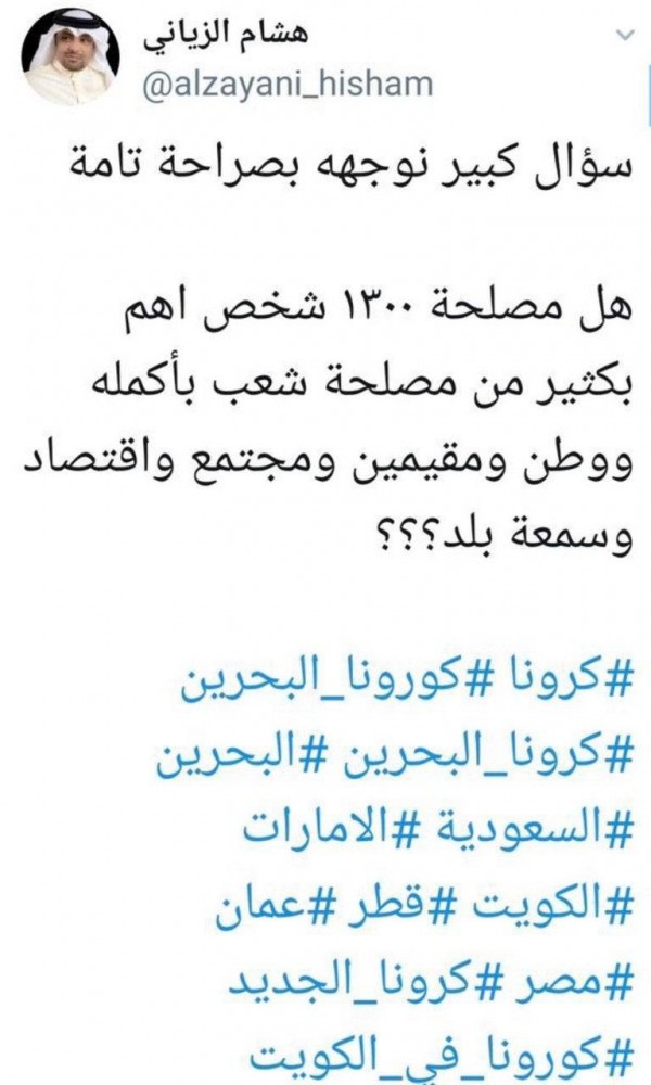 لأن وباء الطائفية تمكّن منه، فلم يعد يستطيع أن يرى إلا من خلال لوثه، يعلم هذا الشخص أن العالم كلّه يدفع ضريبة هذا الوباء الذي لا دين له ولا عرق، وأن العالم كلّه يواجه الآثار الاقتصادية والاجتماعية المنهكة لهذا الوباء، وأن البحرين ليست استثناءً من ذلك، بل هي في وضع أفضل بكثير، ويعلم أن سمعة كل بلد الآن، بما فيهم بلده، مرهونة بكيفية تعاطيها مع هذا الوضع الكارثي، يعلم كل ذلك، لكن وباء هذا الشخص ومن هم على شاكلته من الموبوئين بكورونا الطائفية والكراهية والأنانية والأحقاد والخسّة والرذيلة، هي التي أنطقت منه مثل هذا السؤال الذي أسماه (صريح) فيما هو ليس أكثر من (وقيح).