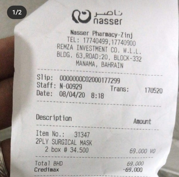 وصوّر المواطن أحمد جمشير مقطع فيديو من أمام أحد فروع صيدلية ناصر، تحدث فيه بحرقة عن بيع الصيدلية علبة كمامات بسعر 34 دينارا بحرينيا، وطالب جمشير وزير وزير التجارة والصناعة النزول على الأرض، و زيارة الصيدليات وحل مشكلة ارتفاع اسعار كمامات الوجه.