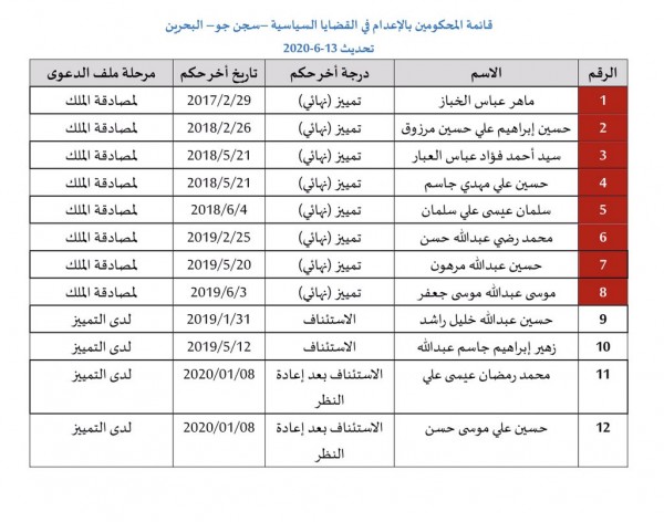 مراة البحرين: أصدرت محكمة التمييز اليوم الاثنين 15 يونيو 2020، قرارها بتأييد حكم الإعدام بحق المعتقل السياسي زهير إبراهيم جاسم. ليصبح بذلك تاسع محكوم بالاعدام بشكل نهائي في انتظار تصديق الحكم من عدمه من قبل الملك.