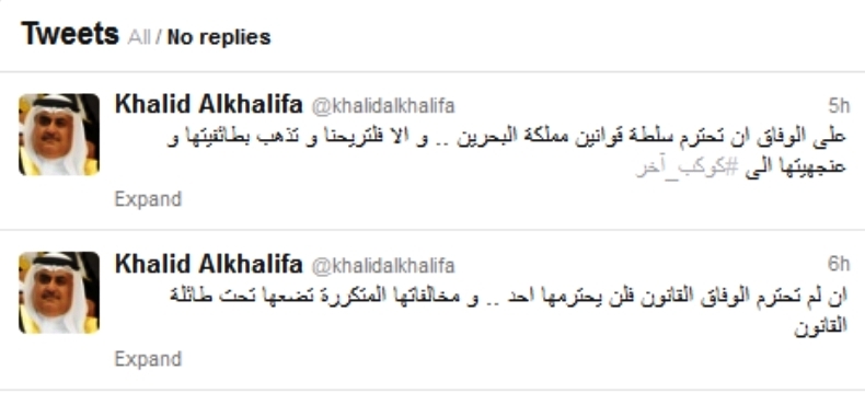 في هذا السياق، فقد أثارت تصريحات وزير الخارجية البحريني، خالد بن أحمد بن محمد آل خليفة، أمس السبت، بشأن، دعوته "الوفاق" بـ"احترام القانون أو الرحيل لكوكب آخر"، أثارت الاستهجان. ووجه بنقد لاذع من جانب النشطاء على "تويتر" الذين افتتحوا "هاش تاغ" أسموه #كوكب_آخر، للتعليق على تغريداته بهذا الصدد، حيث أمطروه بالسخرية.