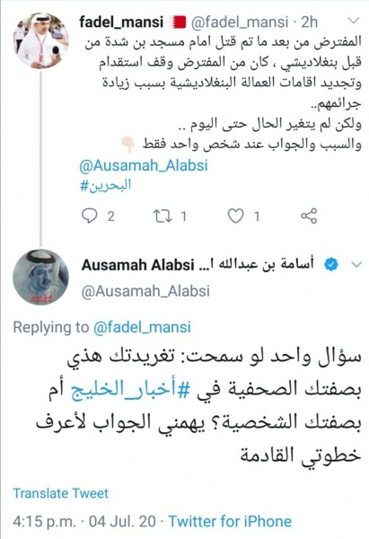 صحافي في أخبار الخليج كان يرى أن استقدام العمال البنغاليين يجب أن يتوقف منذ مقتل إمام جامع بن شدة على يد مؤذن بنغالي، مضيفا «لكن لم يتغير الحال حتى اليوم (..) والسبب والجواب عند شخص واحد» في إشارة للعبسي.