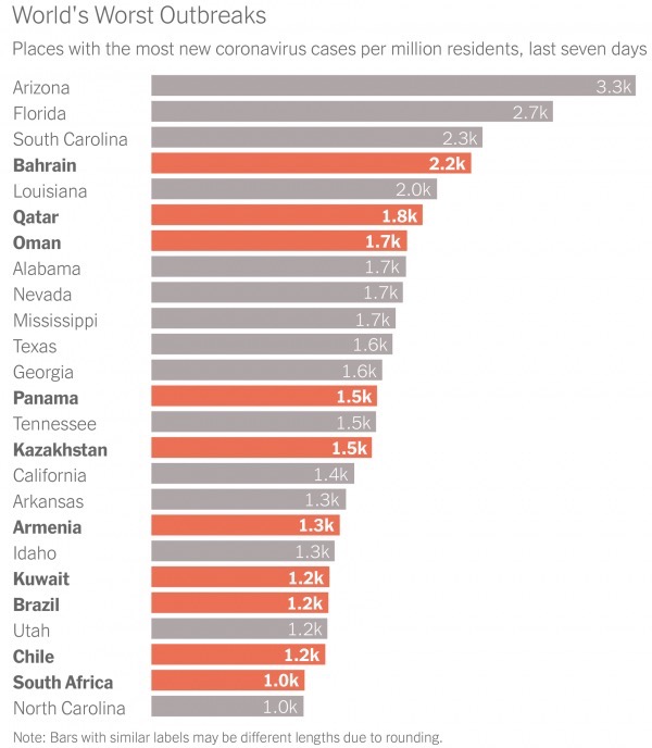 وأوردت الصحيفة في رسم بياني البلدان التي شهدت أكثر الحالات الجديدة المؤكدة خلال الأسبوع الماضي، معدلة بحسب عدد السكان، وتعاملت مع كل ولاية أمريكية كما لو أنها كانت دولة في الرسم.