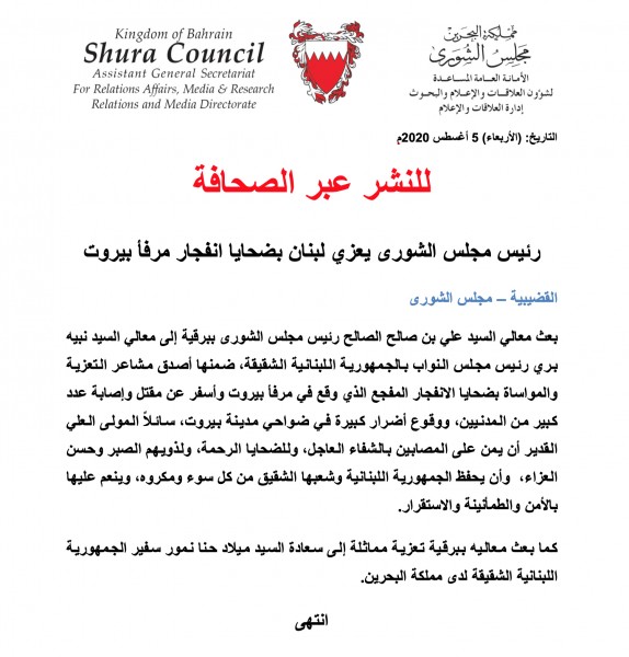 وكان مجلس الشورى بعث بتصريح صحفي إلى وسائل الإعلام المحلية، عن برقية تعزية بعثها رئيس المجلس علي صالح الصالح إلى رئيس مجلس النواب اللبناني نبيه بري وأخرى مماثلة إلى سفير لبنان لدى البحرين ميلاد حنا نمور، للتعزية بضحايا انفجار المرفأ.