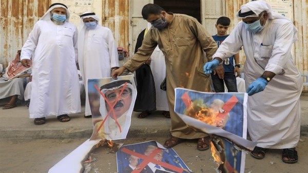 وأحرق المتظاهرون صور الرئيس الأمريكي دونالد ترامب ورئيس الوزراء الإسرائيلي بنيامين نتنياهو وملك البحرين حمد بن عيسى آل خليفة وولي عهد أبوظبي الشيخ محمد بن زايد آل نهيان.