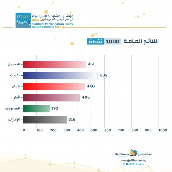 وبحسب التقرير الأول لهذا العام 2020 فقد حلت دولة الكويت في المرتبة الأولى بتسجيلها 535 نقطة من 1000 نقطة في "مؤشر المشاركة السياسية في دول مجلس التعاون الخليجي"، تلتها مملكة البحرين في المرتبة الثانية مُسجلة 451 نقطة.